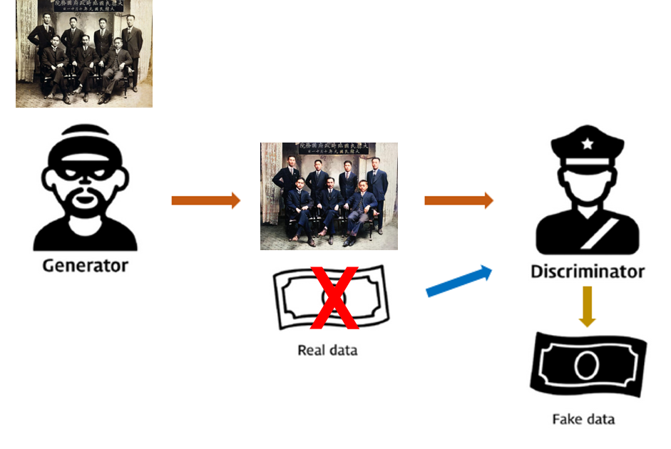 따라서 과거의 데이터를 복원하기 위해 현재의 데이터를 사용해 학습을 진행한다. 만약 컬러사진이 있다면 이것을 흑백으로 바꾸어 지폐 위조범에게 주고 컬러 사진을 경찰에게 주는 것이다. 사진의 개수를 무한히 늘린다면 위조범은 채색을 하는 스킬이 늘 것이고 경찰은 감별해내는 스킬이 늘 것이다. 결과적으로 어떤 사진이 들어와도 도둑은 채색을 할 수 있는 능력을, 경찰은 현실과 위조범의 사진을 보고 현실과의 구별 능력이 생길 것이다.