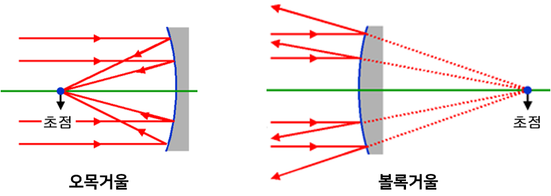 보통 중력에 의한 빛의 굴절이 아닌 이상 렌즈나 거울을 통해 굴절 혹은 반사를 하게 된다. 렌즈를 사용한다면 렌즈를 통과하며 빛을 모아주거나(볼록렌즈) 퍼지게(오목렌즈)할 수 있지만 거울은 렌즈와 정 반대이다. 오목거울은 볼록렌즈처럼 빛을 모으고 볼록거울은 오목렌즈처럼 빛을 퍼트린다. 물론 아무렇게나 퍼트리고 모으는 것은 아니고 특정점(초점)을 기준으로 빛의 굴절과 반사가 일어난다.
